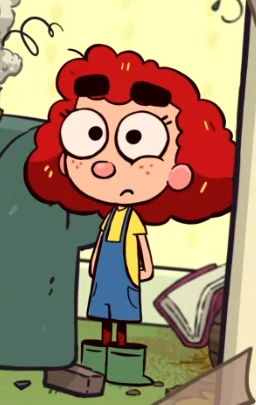 Annie is a young 9-year-old farmer of medium height. She has fairly pale skin, visible freckles, and fluffy red hair which is in a ponytail bun.